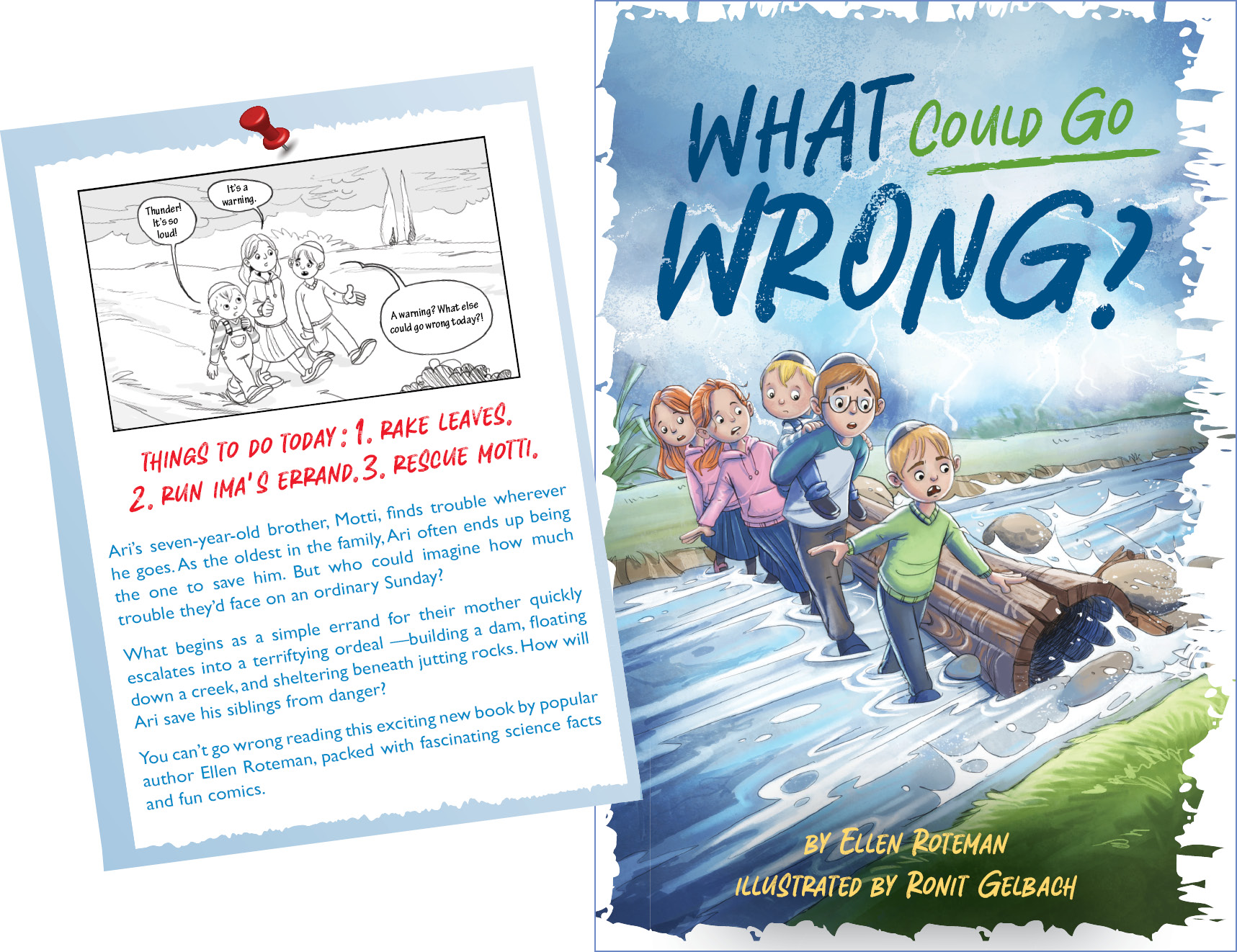 The kids know the way to Aunt Tovah’s, and they expect to arrive quickly… and have the rest of the day to play. But the weather has a different idea. Their errand becomes an ordeal — from getting soaked by heavy rain, to navigating around the churning river, to thinking quick when the wind poses its own danger.